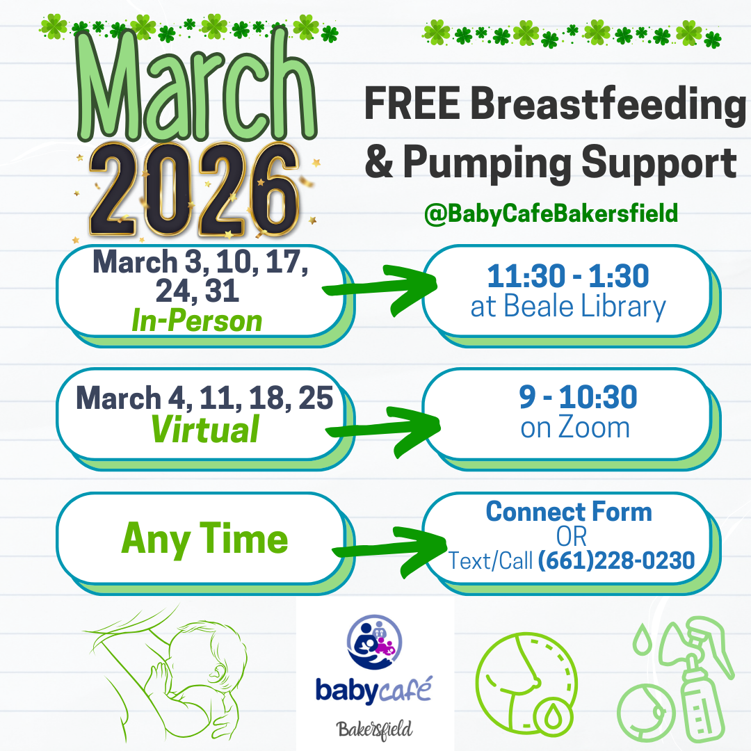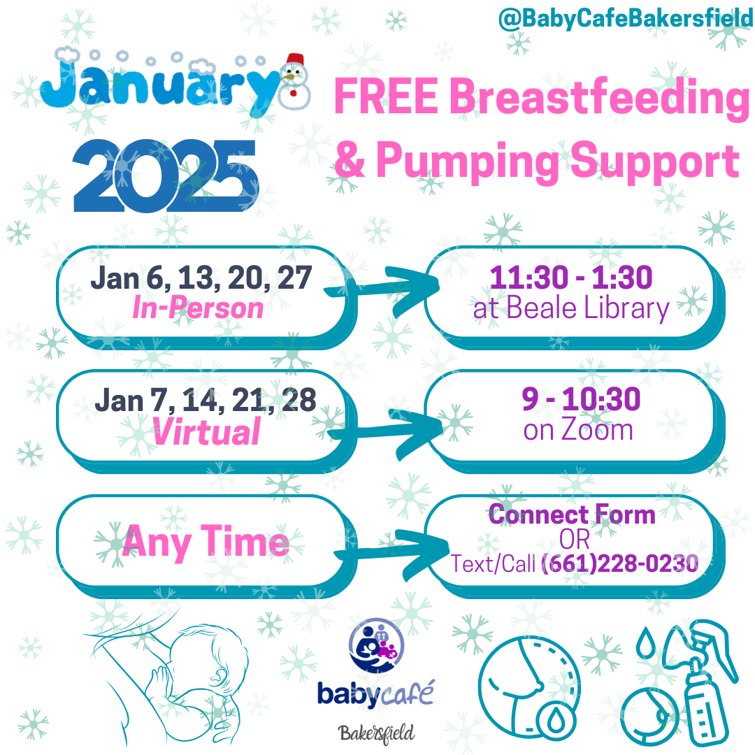 *When you call or text, please keep in mind that you may receive a call back or a text from a number you do not recognize. The IBCLC will identify herself as being from Baby Café. If your voicemail box is full, we will not be able to leave you a message to let you know we have been in touch, so please check that!